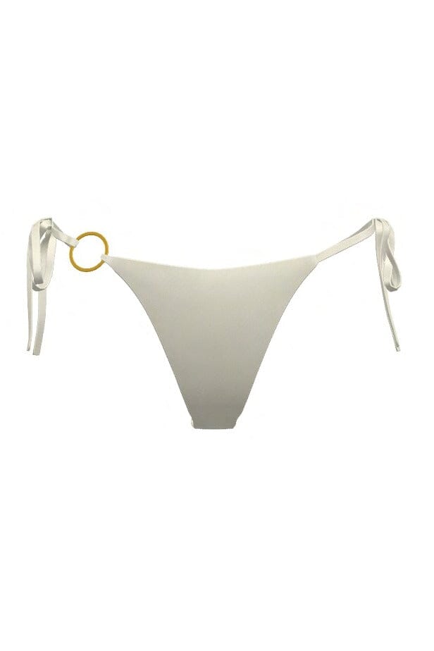 The Natalia Brazilian thong bikini bottom is our skimpiest yet with a low-rise waist, high cut, and thong back coverage. It features a coconut ring at the right hip and adjustable side ties for a customizable fit. Wear this skimpy thong bikini bottom with the Brya Ring Top for your next tropical getaway. #GETWET